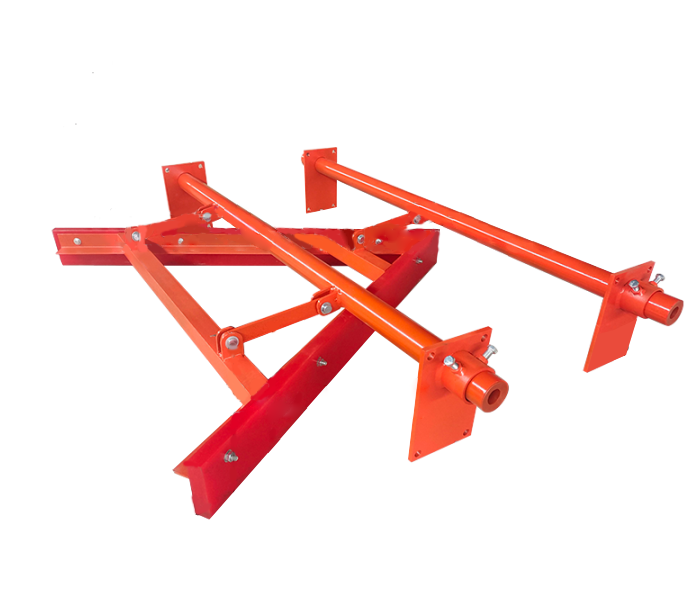 安裝在帶式輸送機(jī)機(jī)尾改向滾筒前端回程皮帶上表面,清掃回程皮帶上表面的殘留物,避免殘留物料夾在機(jī)尾滾筒中造成輸送帶和滾筒的損壞或輸送帶跑偏。