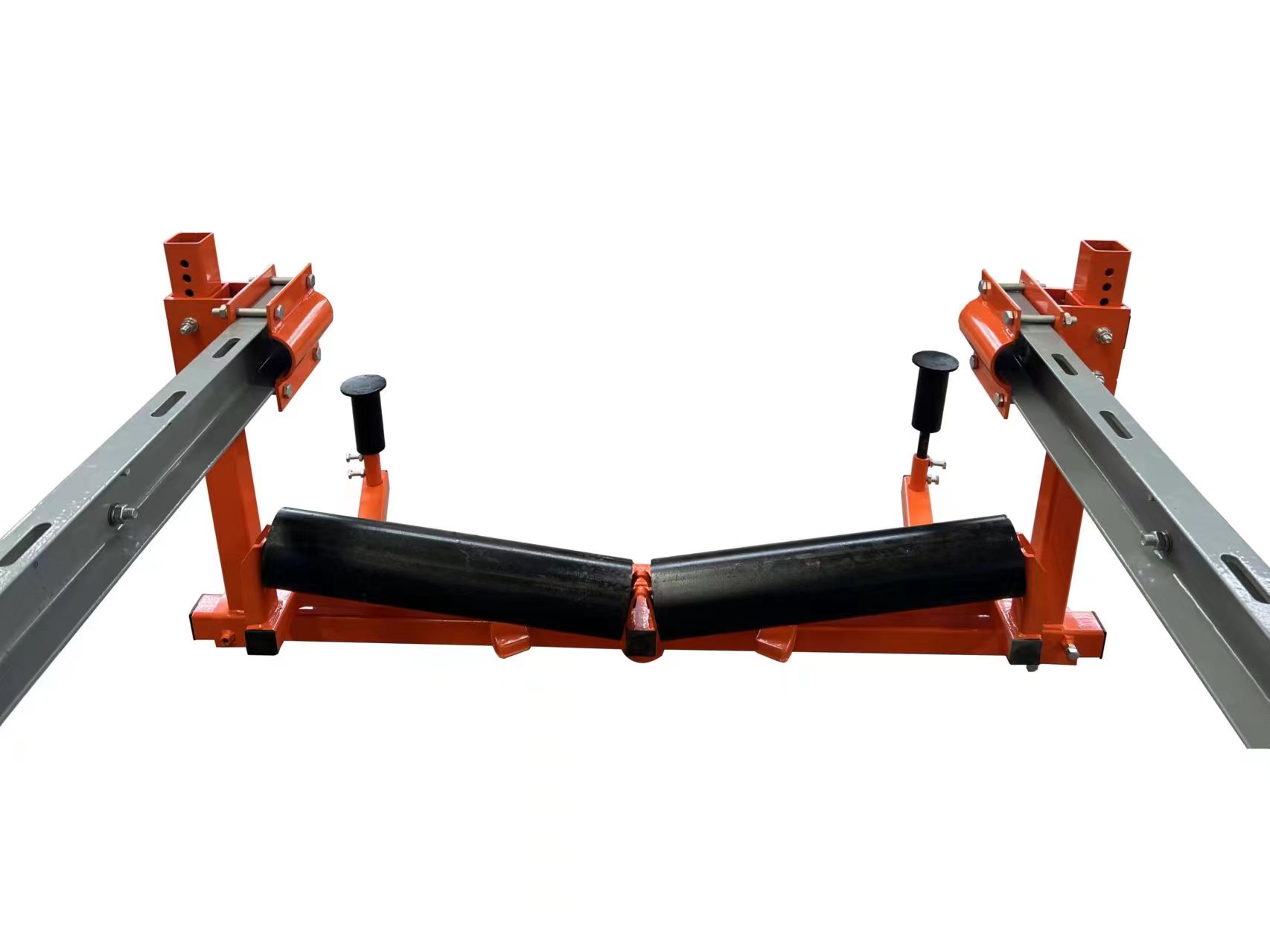 吊掛下糾偏裝置主要是針對由于種種原因造成的皮帶跑偏問題而設(shè)計(jì)的一 種機(jī)械式糾偏裝置。工作的原理:皮帶在跑偏的過程中,皮帶會觸碰立輥進(jìn)而帶 動整個糾偏形成一定的糾偏角度,從而迫使皮帶進(jìn)行歸位。